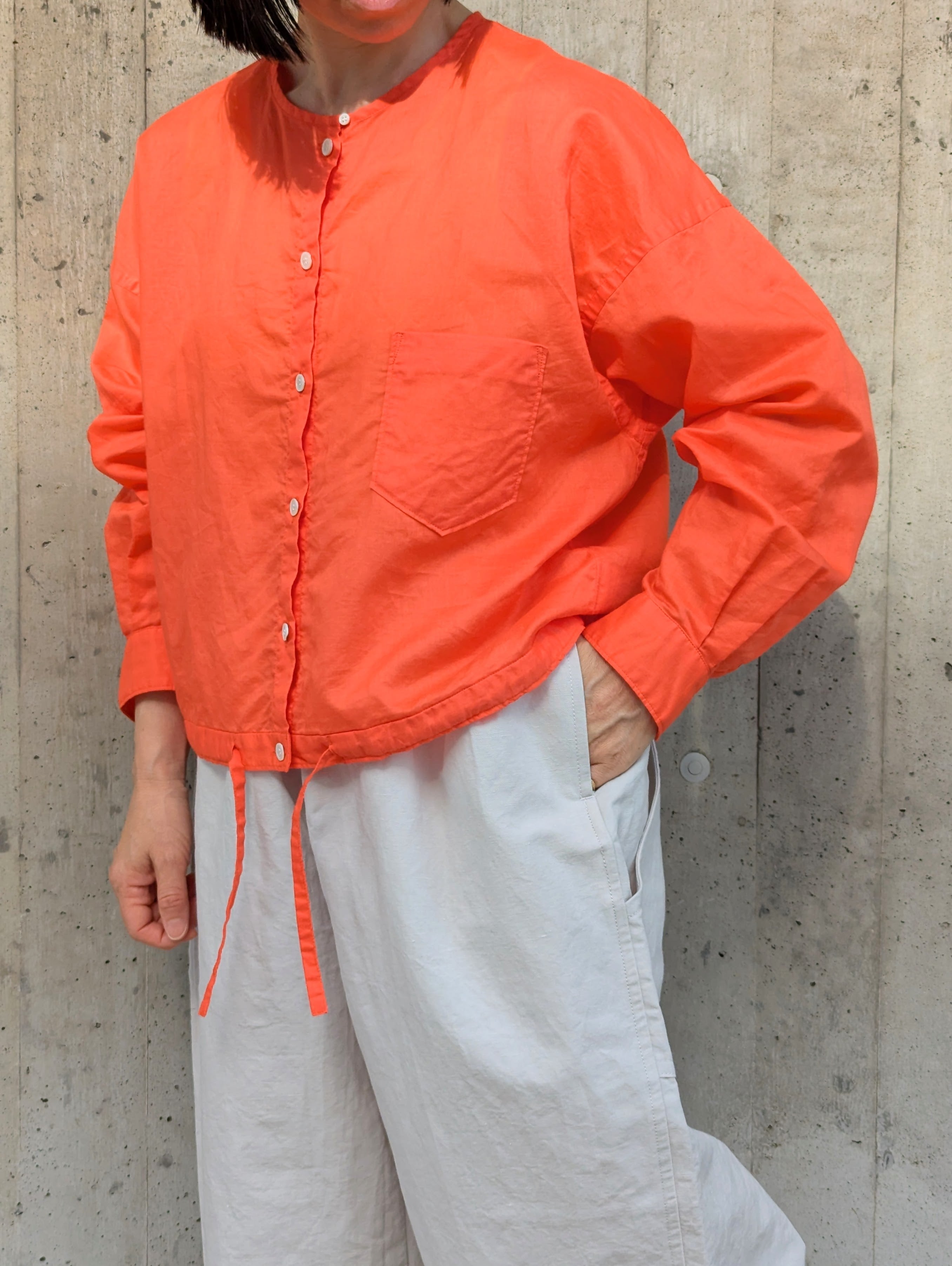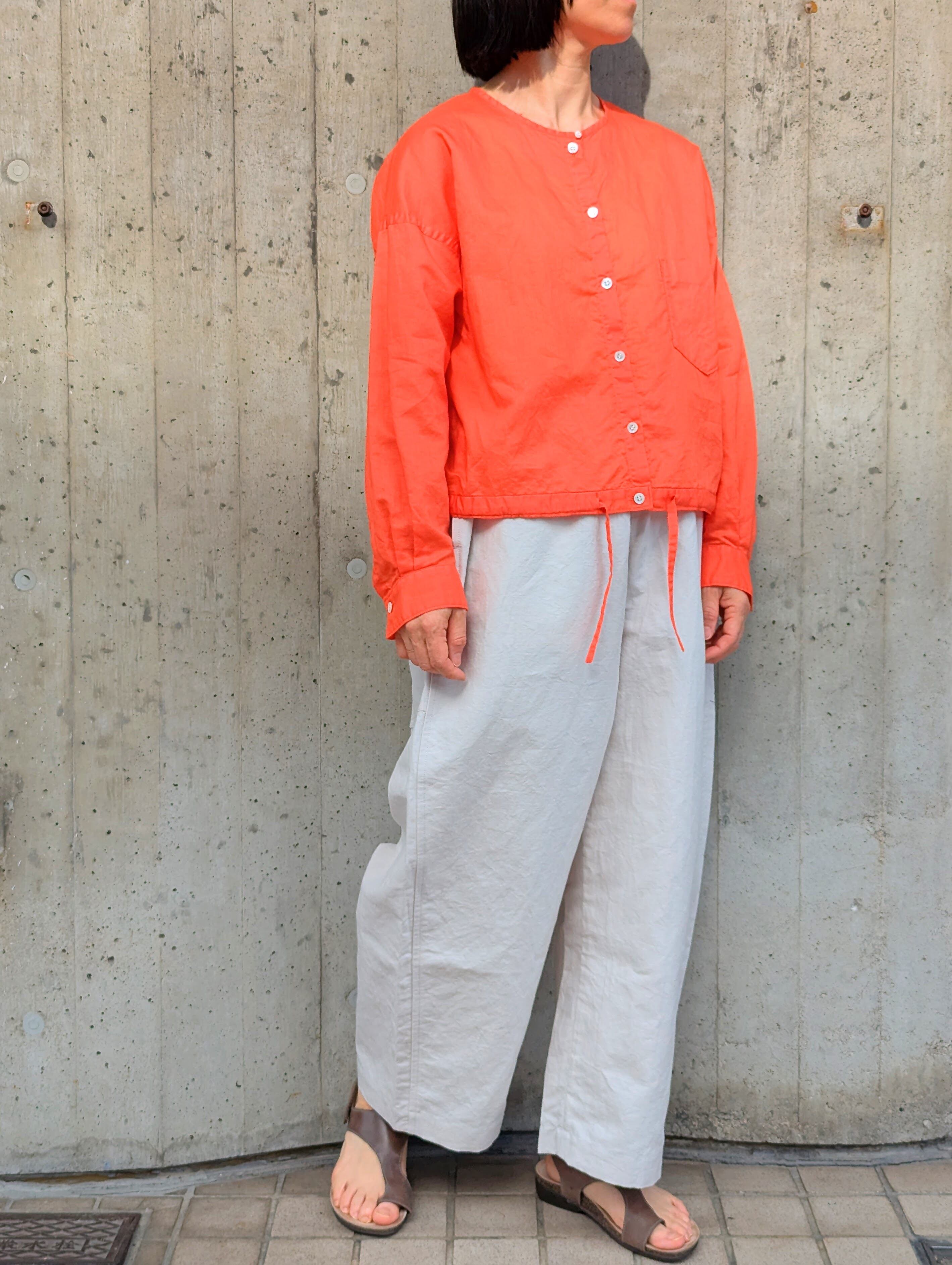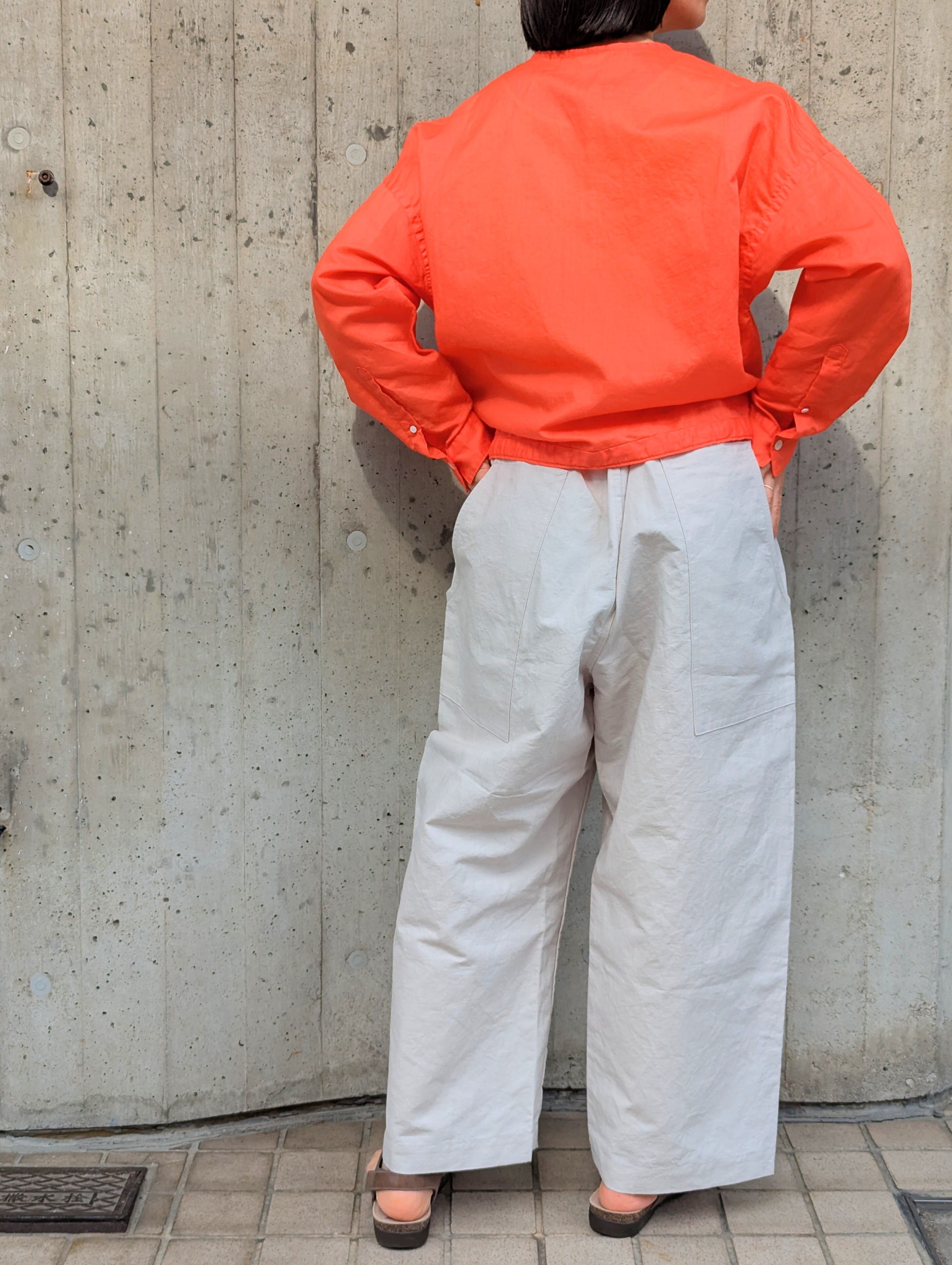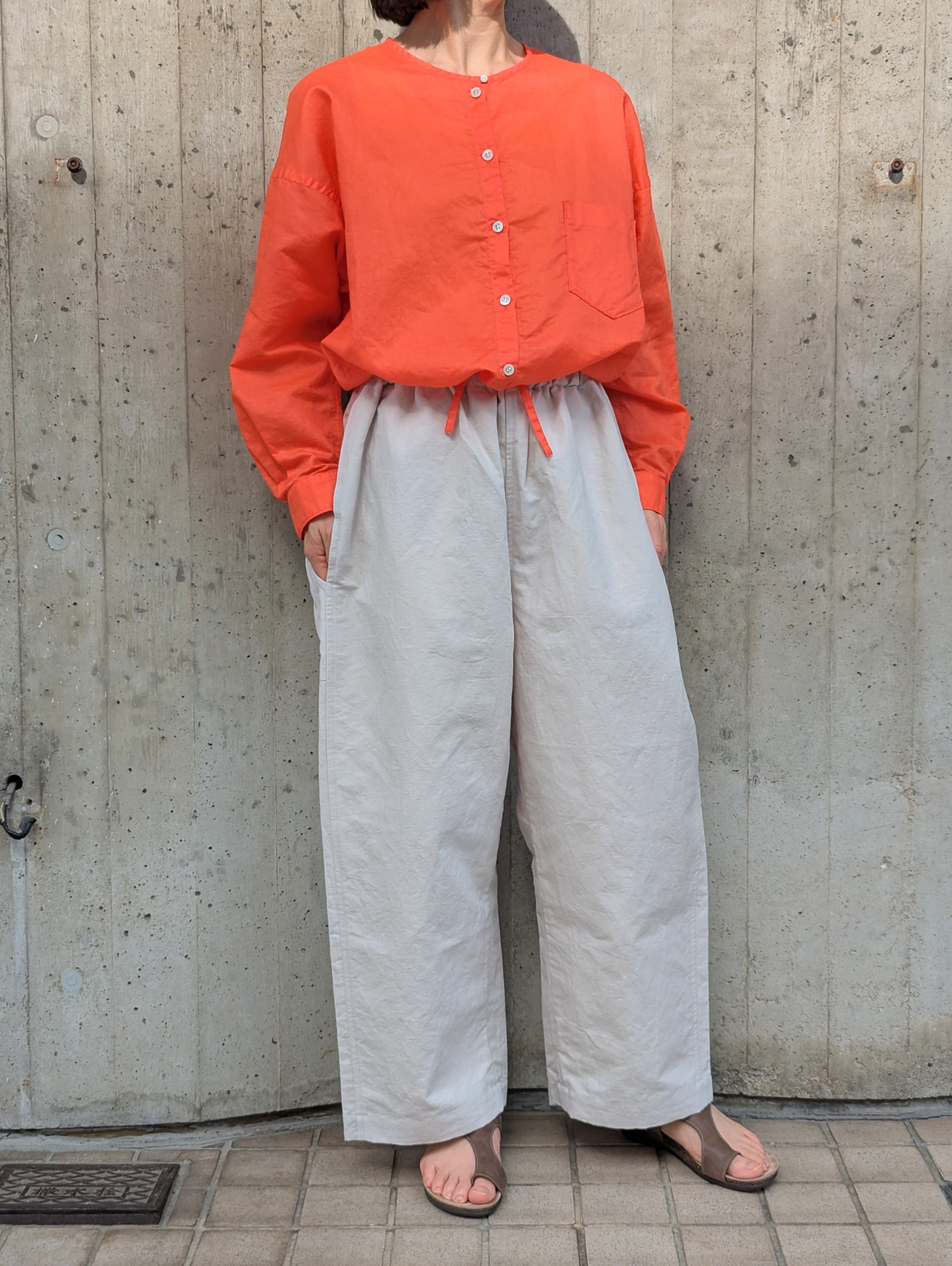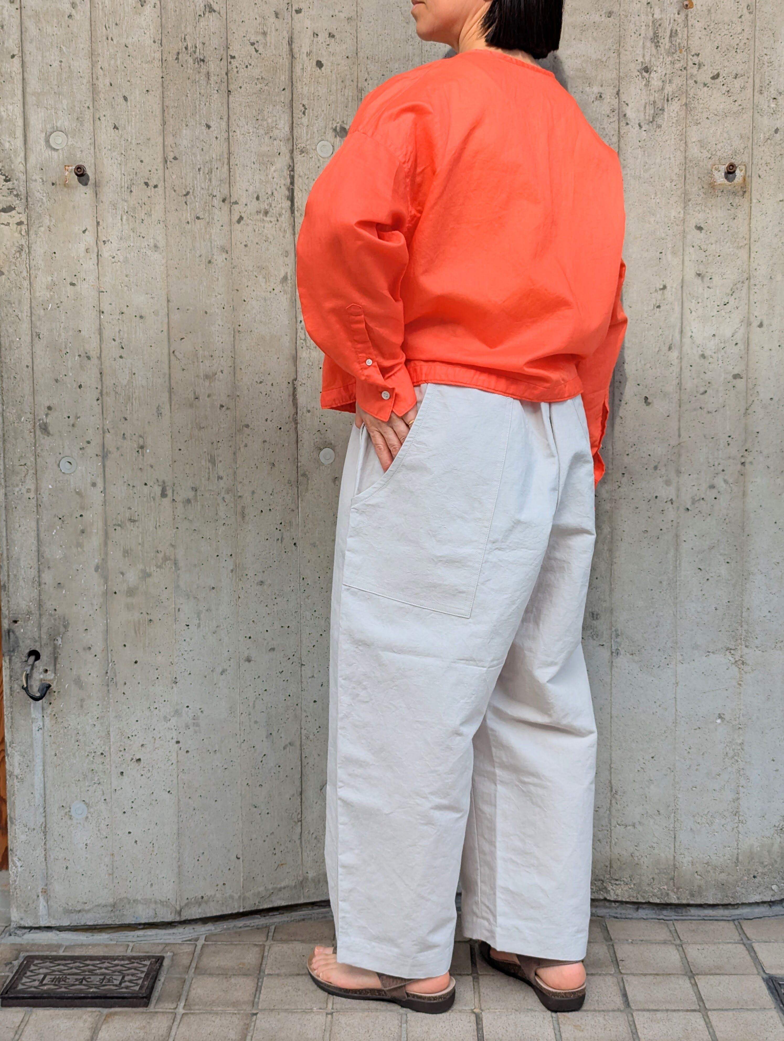 裾に共布のリボンが通されているので、絞るとふわっとしたシルエットになり、パンツでもスカートでもバランスの良い感じで着用していただけます。