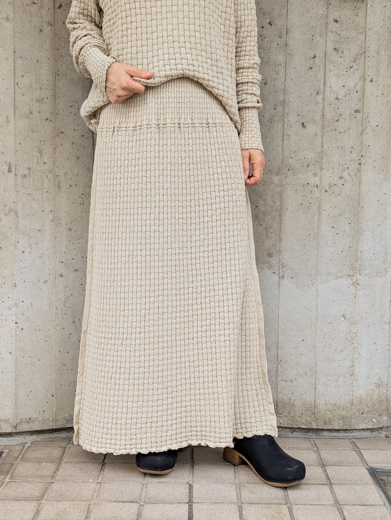 Material:籠模様をイメージした立体的な編み柄をホールガーメント機で編み立てました。表情感のあるサラッとした風合いの綿混ブークレ素材で快適さが持続するため、長いシーズン着用いただけます。ウェストにタック編みをふんだんに作り、ぴったりしすぎずゆとりを持ったシルエット。裾中心のスリットは前後お好きな方で着られます。Oni 050と合わせるとセットアップになります。洗濯機の弱水流で洗えて、シワになりにくい素材です。