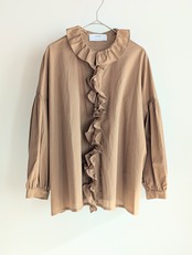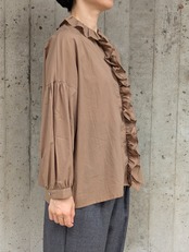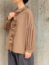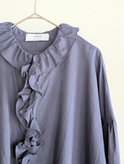 上品で高級感のあるコットンローンを使用したブラウス。フリルが施された襟が目を引き、シンプルなスタイルに華やかさをプラスします。軽やかなコットン素材は肌触りが良く、季節を問わずに快適な着心地を提供します。
