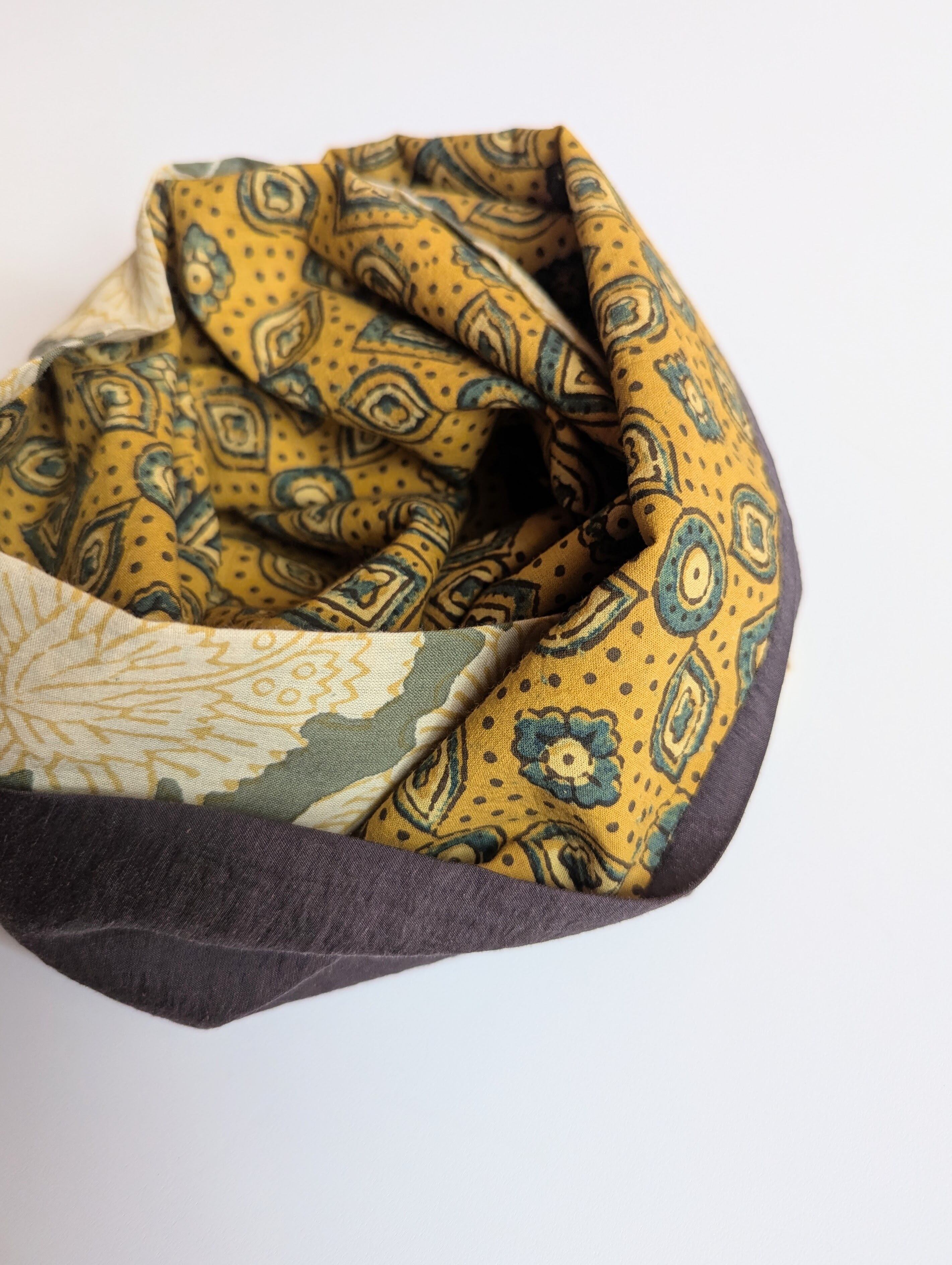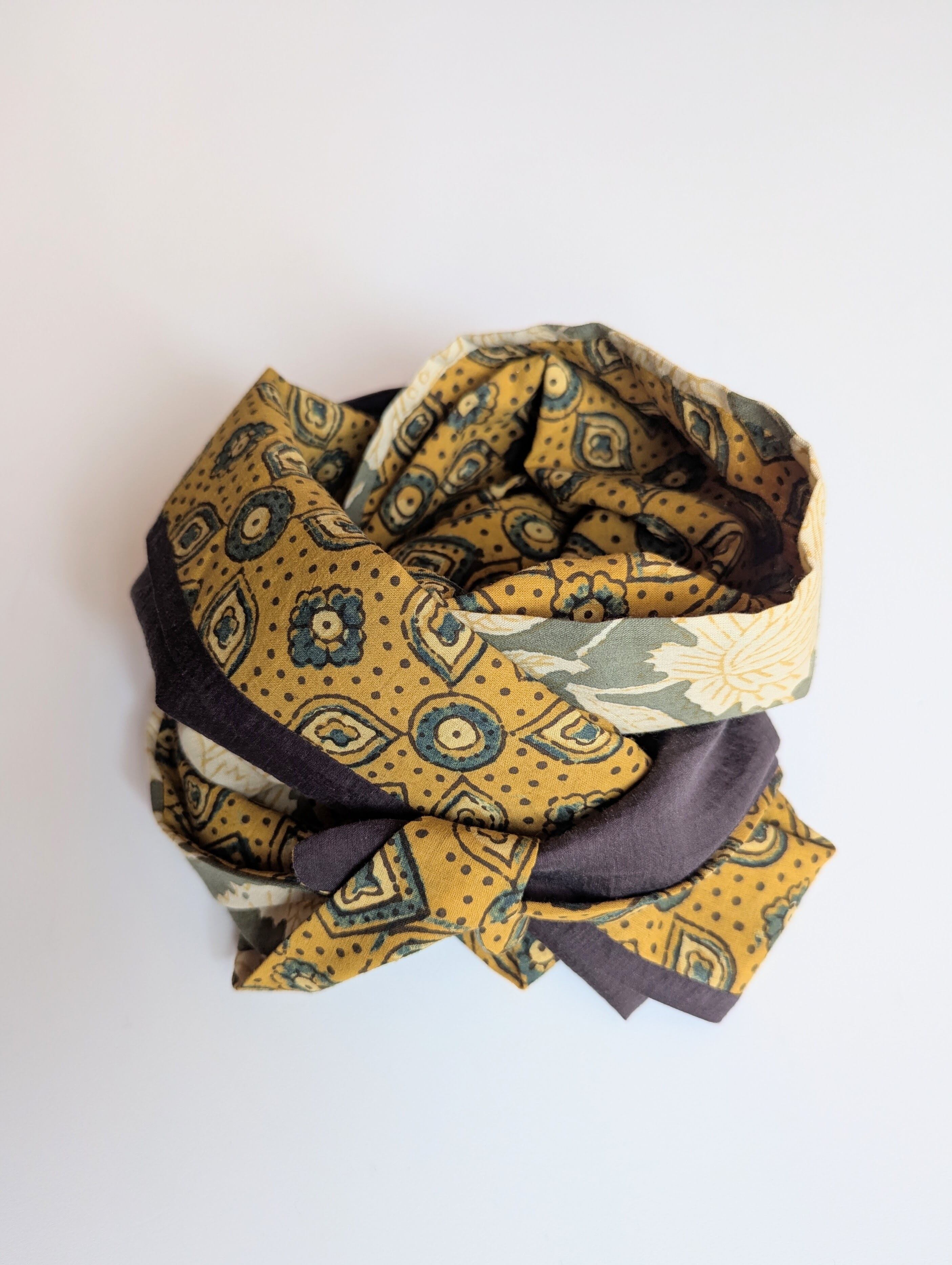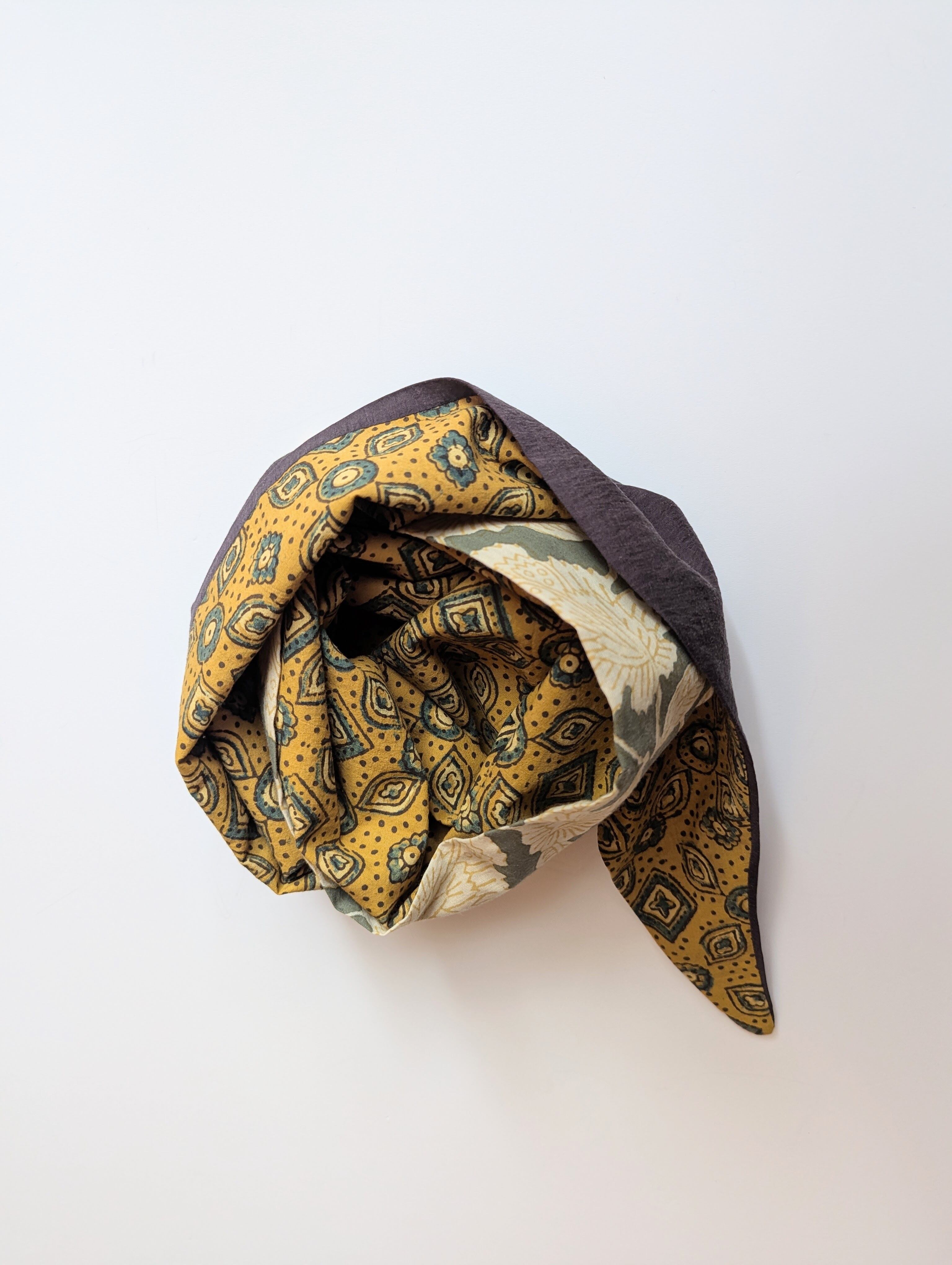 広めの幅は頭を大きく包んだり ねじってポイントにしたり 結め目の位置を上にしたり下にしたりと、使い方は自由自在です。