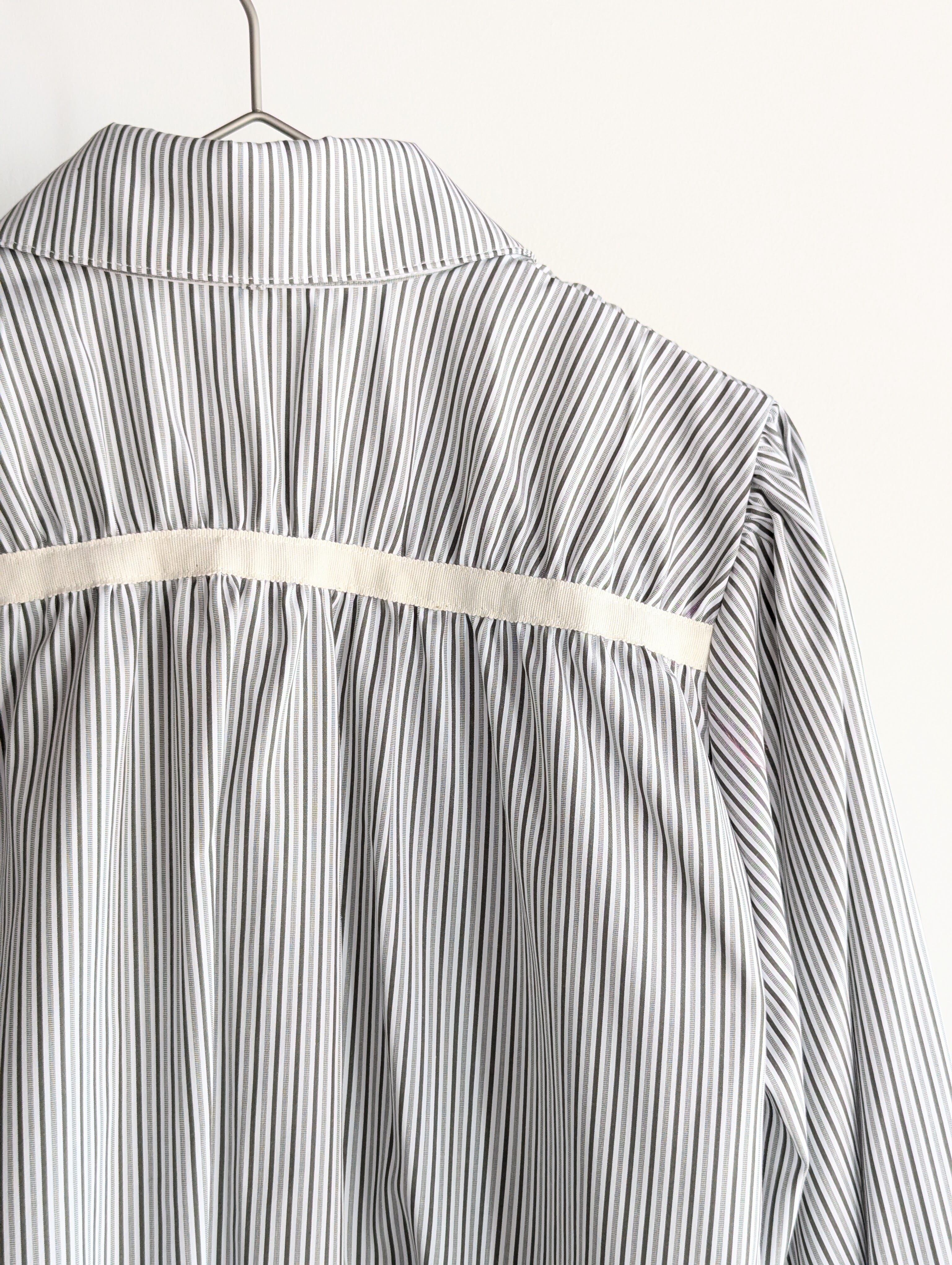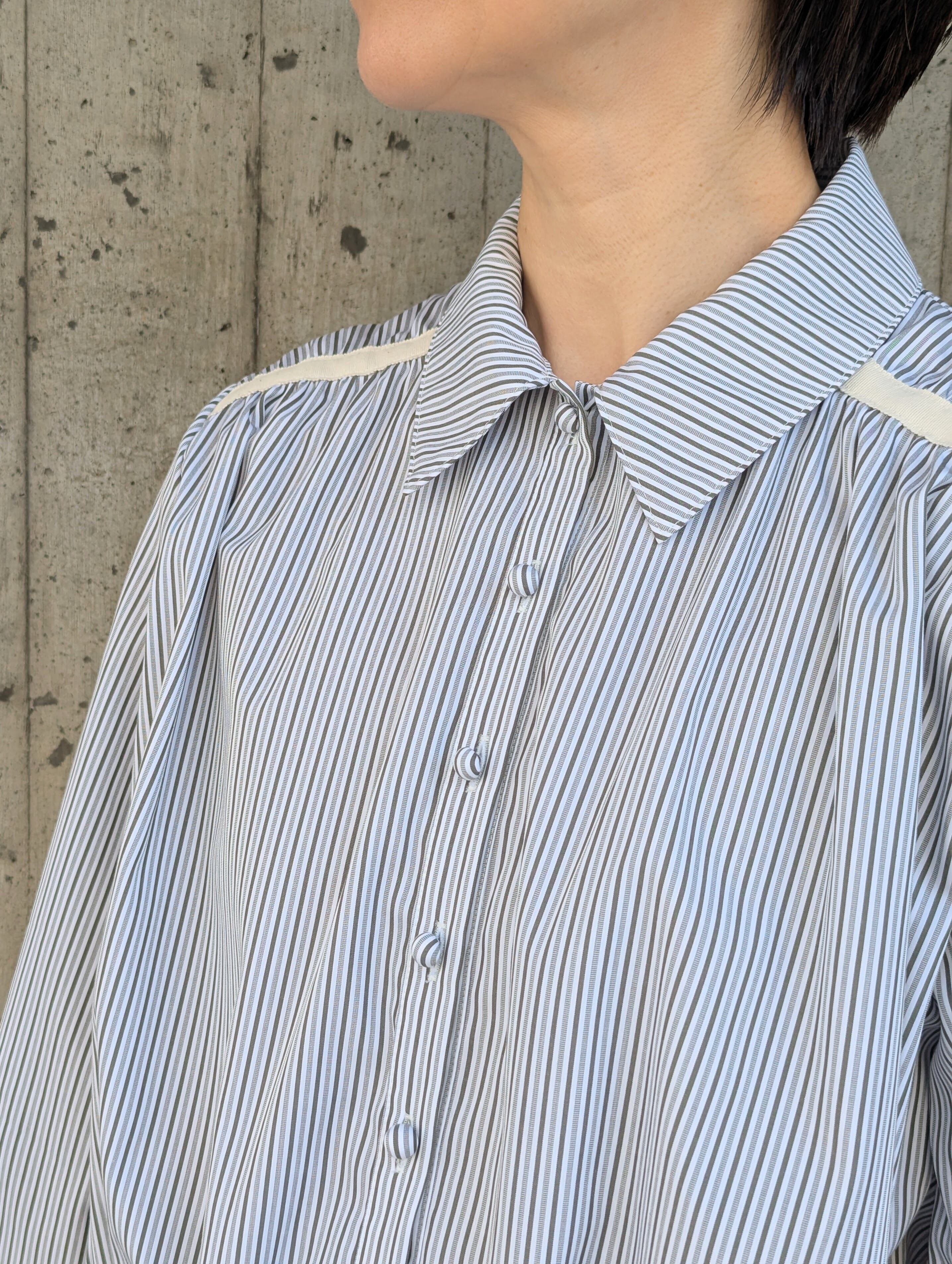 一般的なストライプに比べタテ系本数を 2割ほど多くすることで高級イタリア生地のようなはっきりとした美しいラインに仕上げた100/2のブロード。原料は超長綿コンパクト系を使用しており、紡績の際に通常出てくる毛羽を内側に織り込むことで各段に毛羽が少なくなり光沢のあるきれいな表面にしています。さらに、最終加工でなめらかな風合いを引き出し、ハイクオリティなストライプとなっております。今季のストーリーに出てくる学校の制服のカラーパレットにとても近しかったため選んだ生地になります。