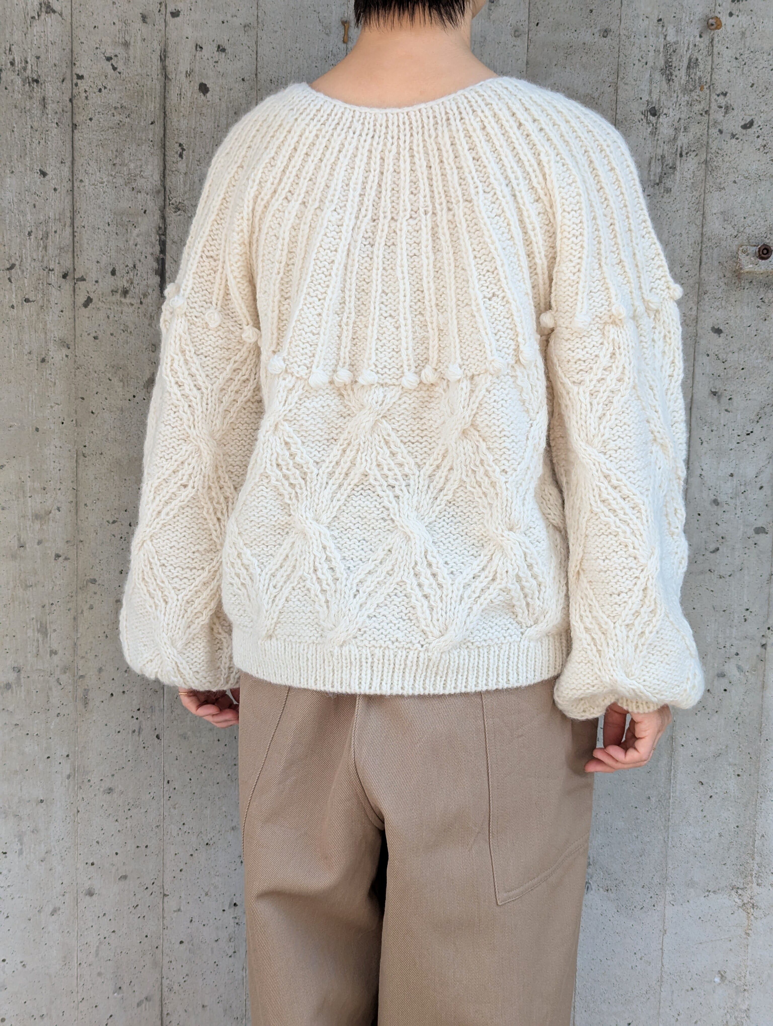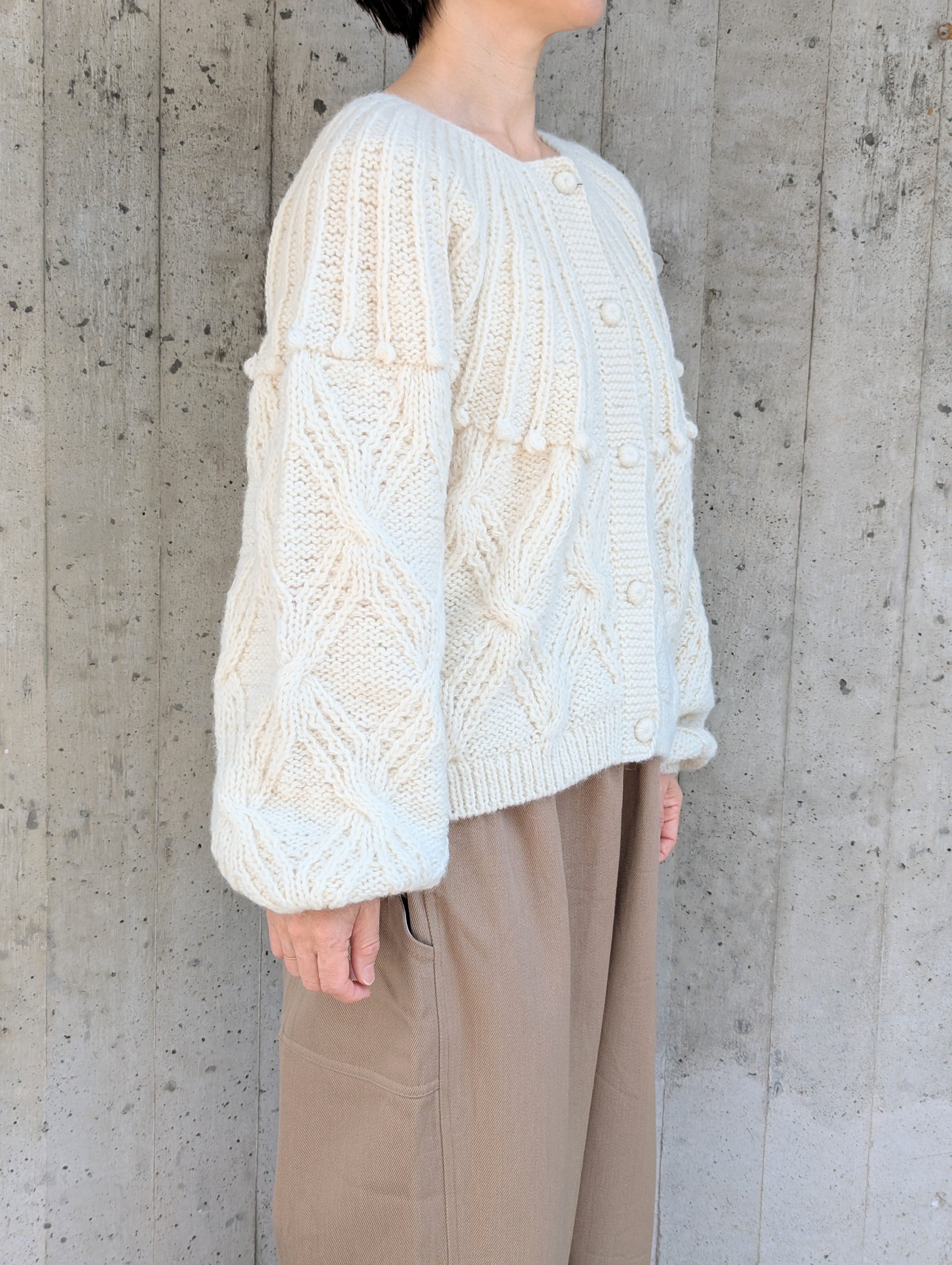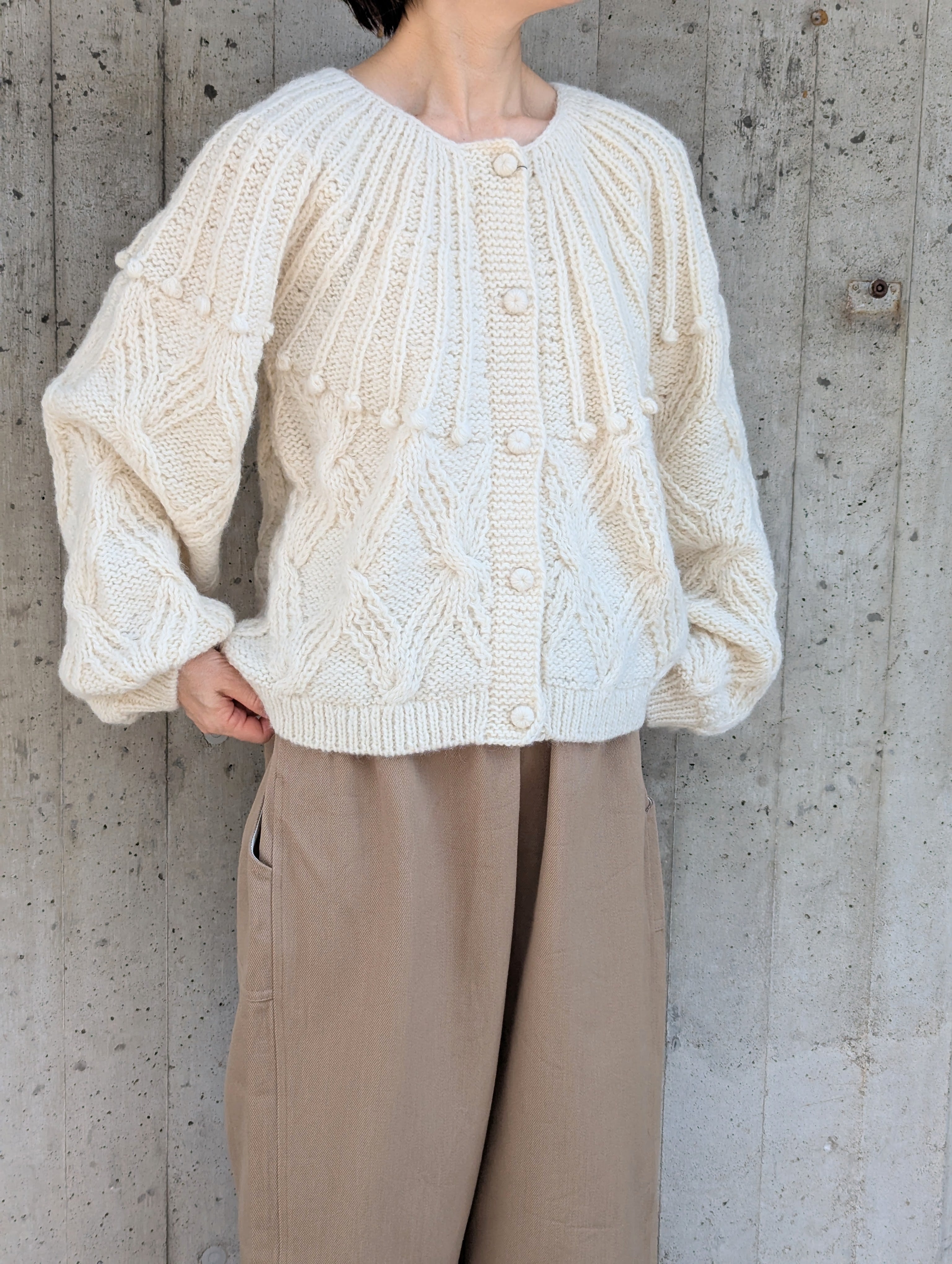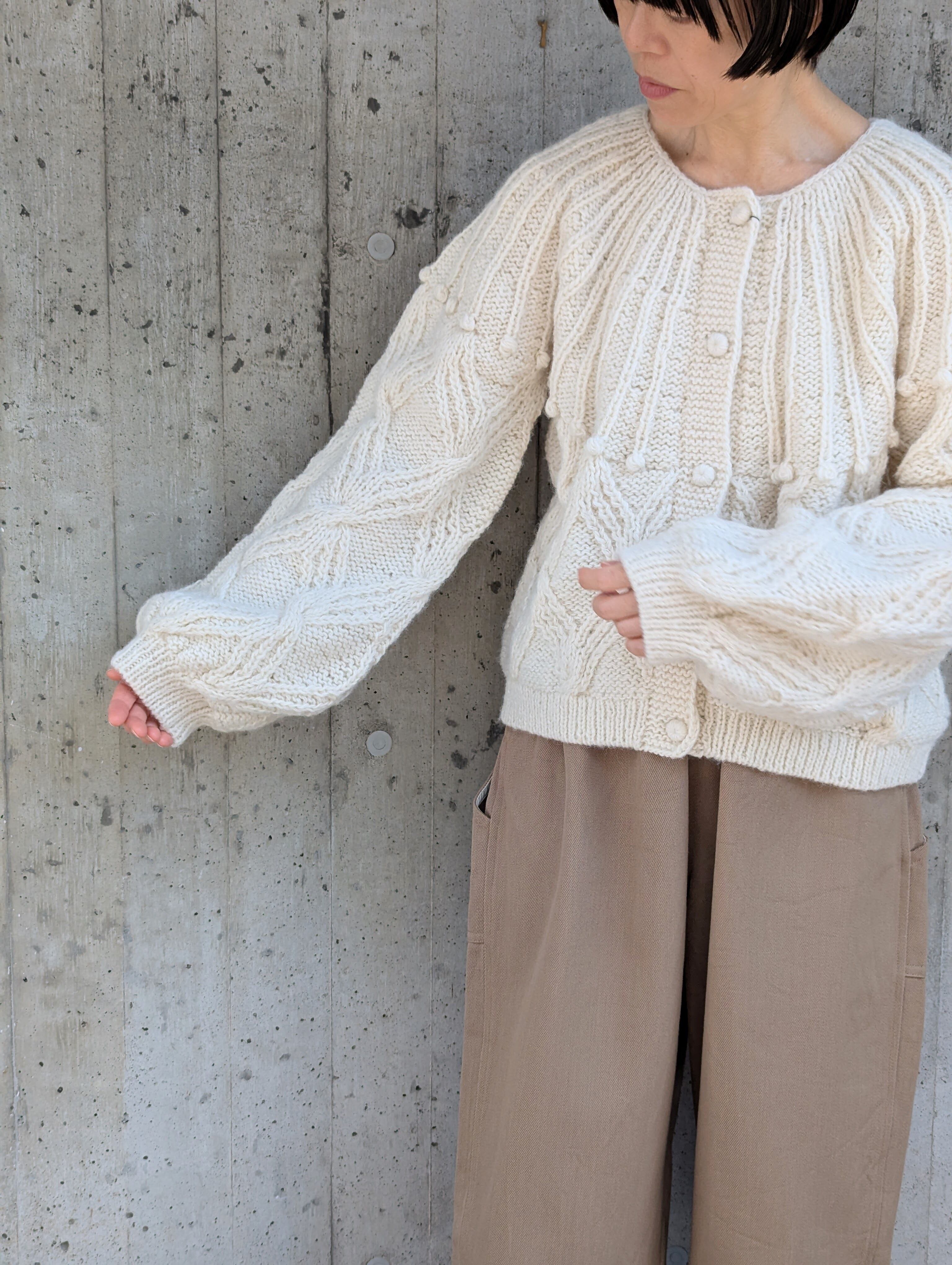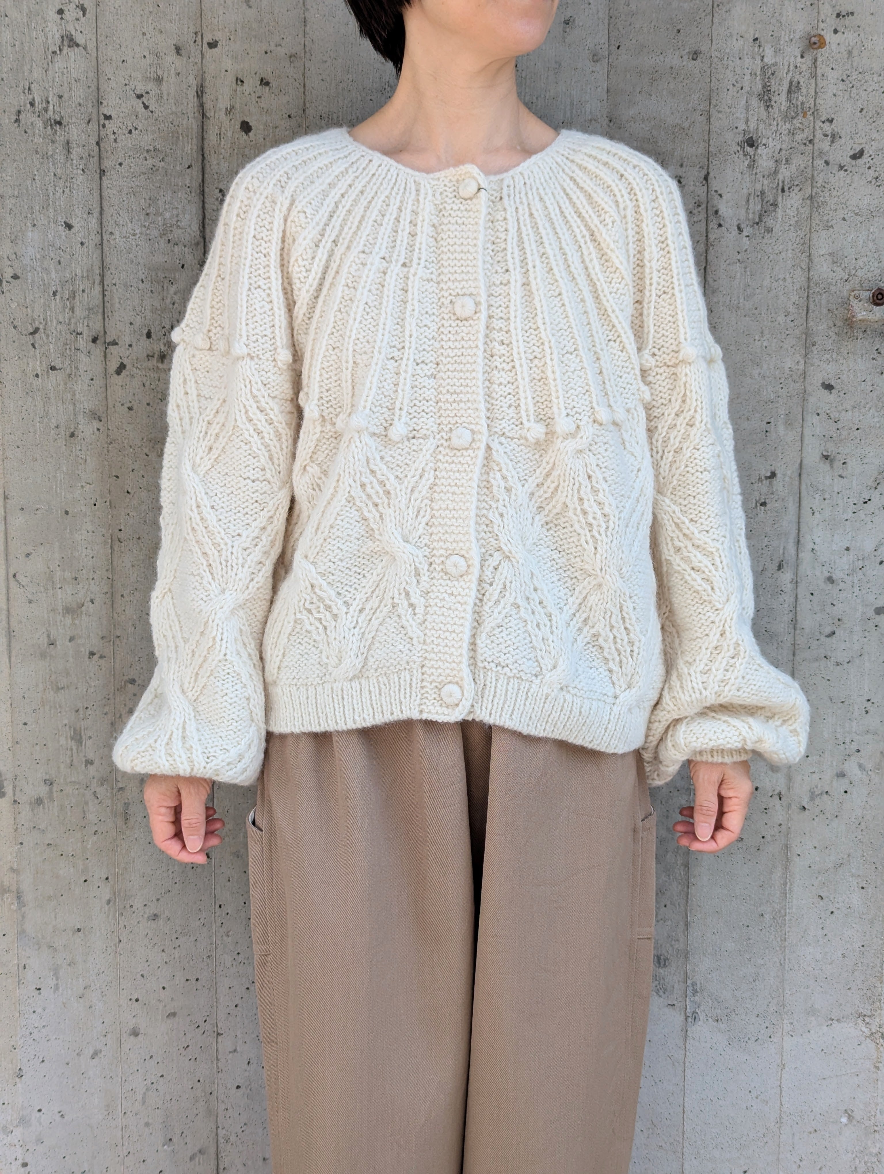 この手編み2wayニットは、カーディガンとしても自由に楽しめるデザインです。手編みならではの求心柄が特徴で、あたたかみと個性を兼ね備えています。天然繊維にこだわり、ウールとアルパカが贅沢に使用されているため、肌触りも抜群です。