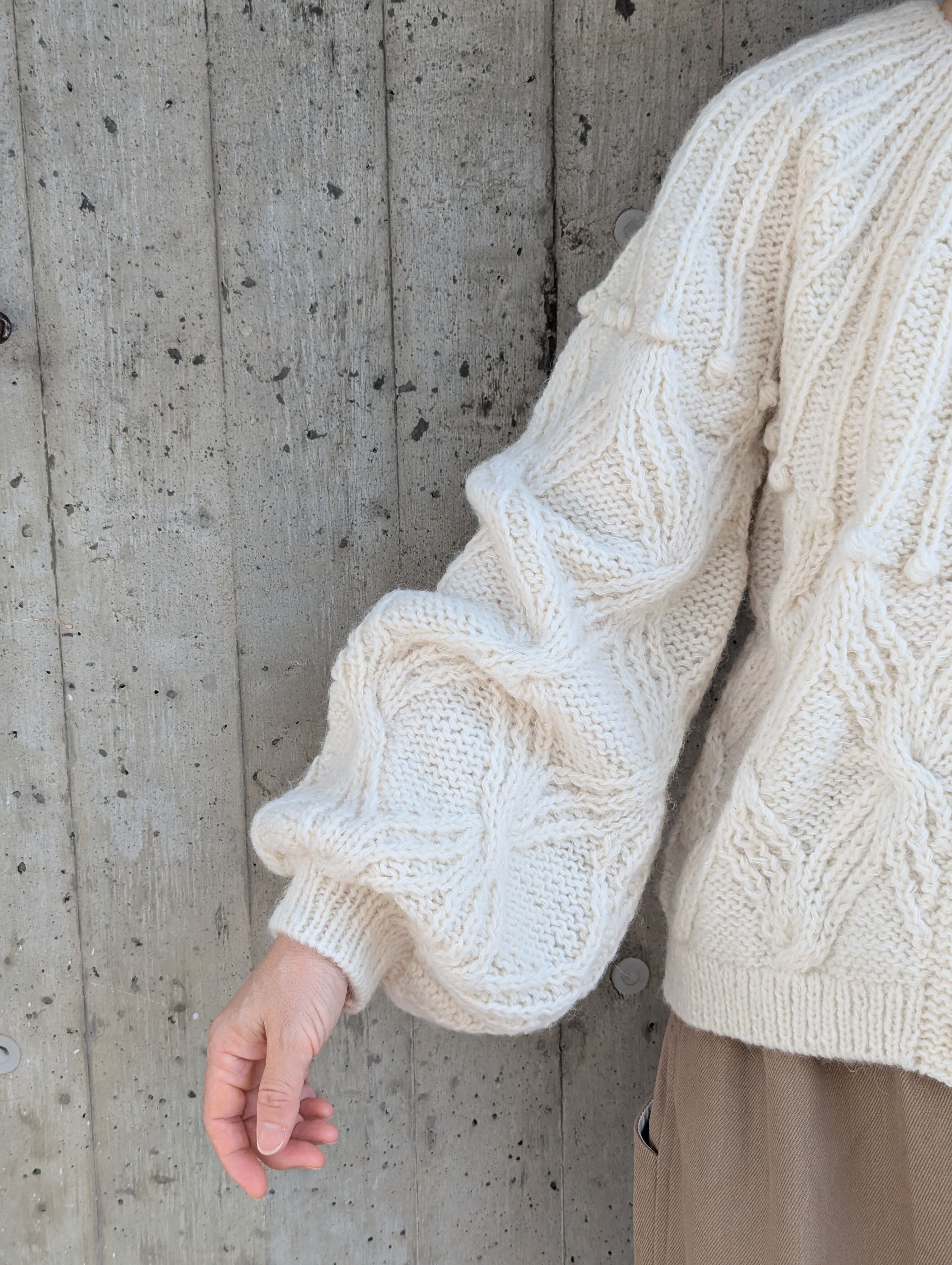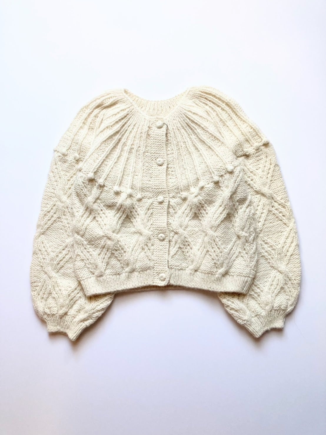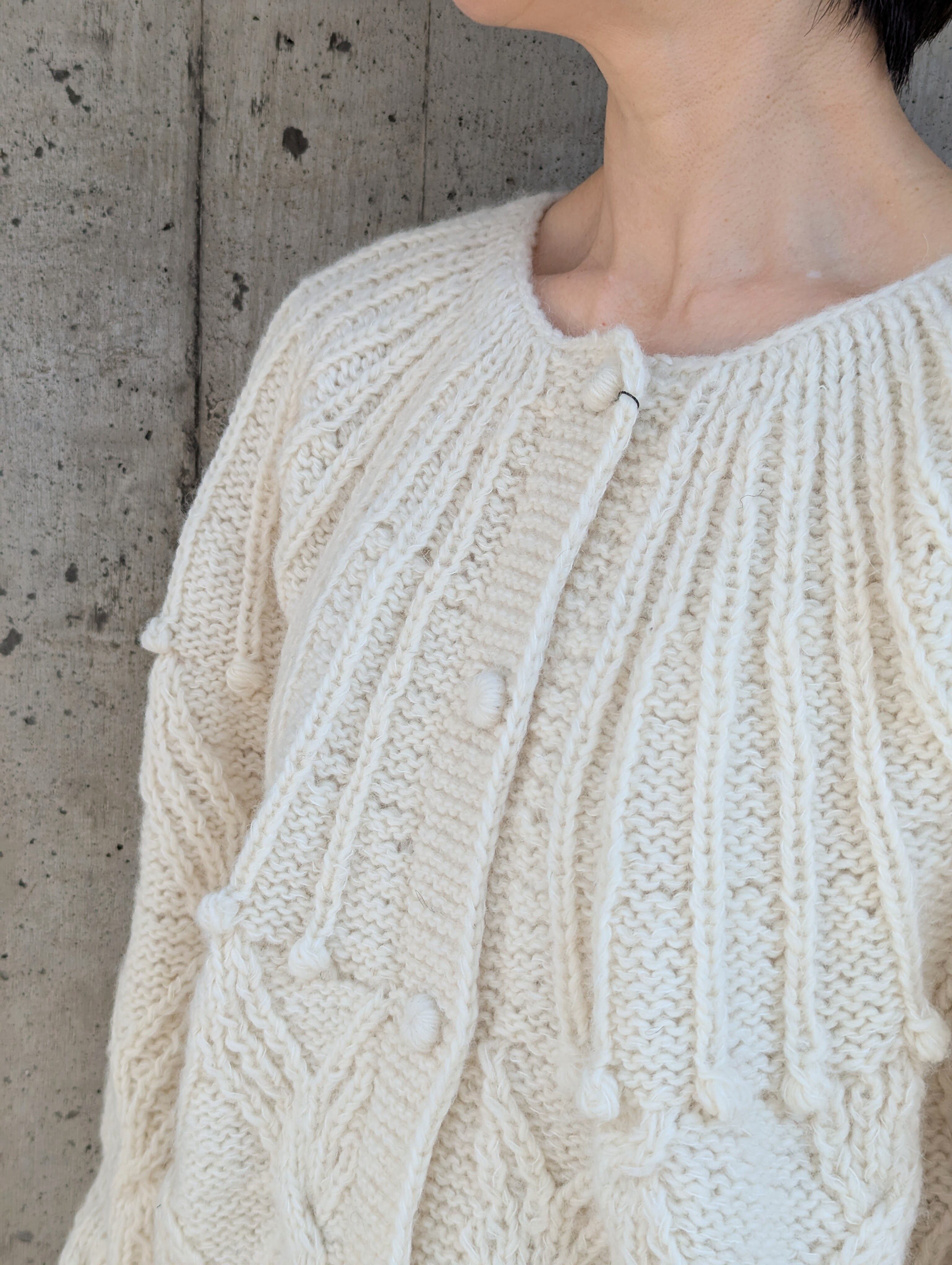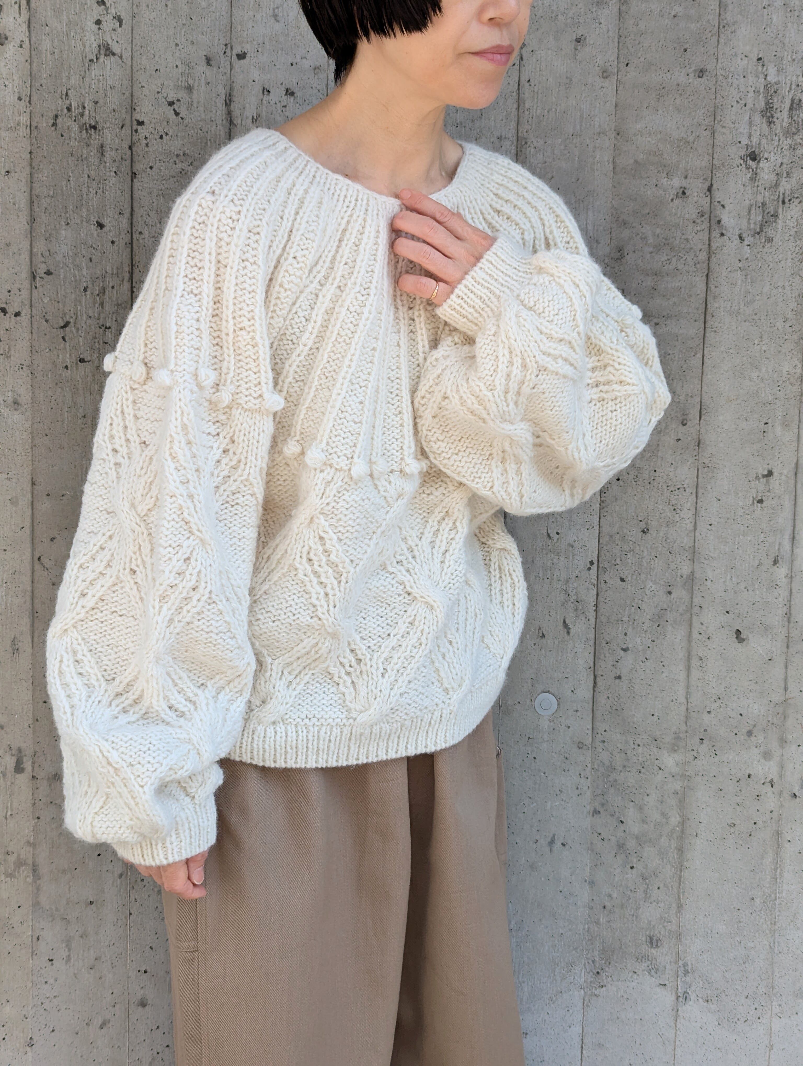 この手編み2wayニットは、カーディガンとしても自由に楽しめるデザインです。手編みならではの求心柄が特徴で、あたたかみと個性を兼ね備えています。天然繊維にこだわり、ウールとアルパカが贅沢に使用されているため、肌触りも抜群です。