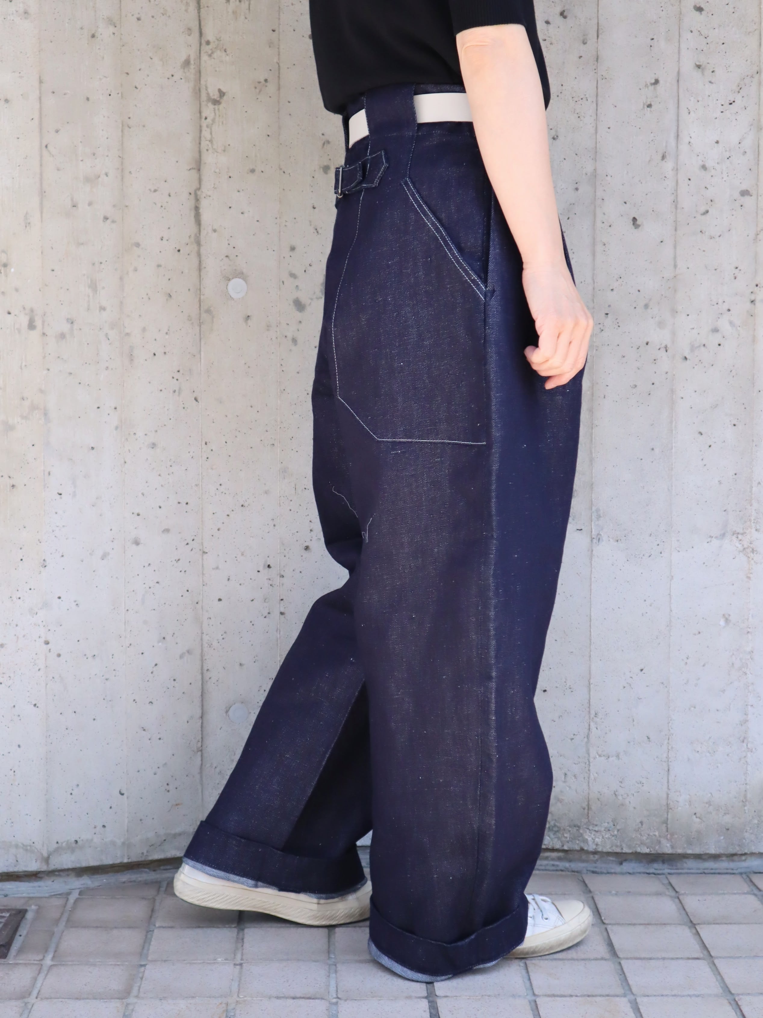 お尻が大きく見えてしまうワイドパンツの難点を改良して、横からのシルエットに特にこだわって作られました。